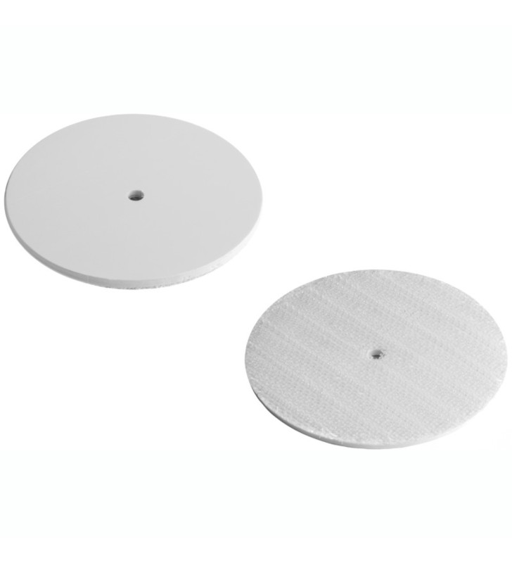Rigid PVC discs with hook and loop tape and central hole for mechanical fastening.
