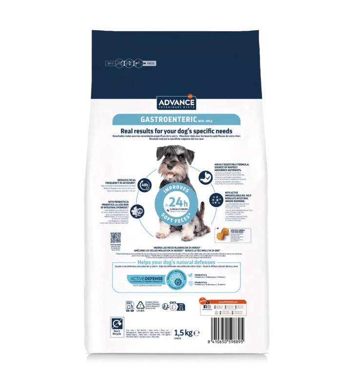 * ADVANCE VETERINARY DIETS Gastroenteric Mini contains probiotics, prebiotics and immunoglobulins
