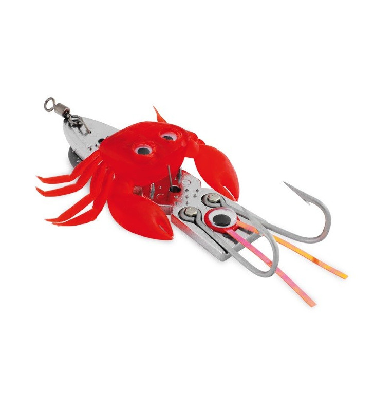 Polpara zavorrata con piombo antiribaltamento, è armata da una coppia di ami zincati estremamente affilati e robusti. Per aumentarne l’attrattività la base è verniciata in silver riflettente e monta un granchio artificiale particolarmente realistico dotato di occhi mobili e di un altro occhio mobile aggiuntivo posto alla base degli ami corredato di due filamenti riflettenti. Estremamente adescante è adatta a qualsiasi tipologia di fondale, sia sabbioso che misto, essendo anti-incaglio si utilizzata a strascico trascinandola sul fondale dalla spiaggia, dalla barca o dalla banchina per creare nuvole di sabbia attiranti.
