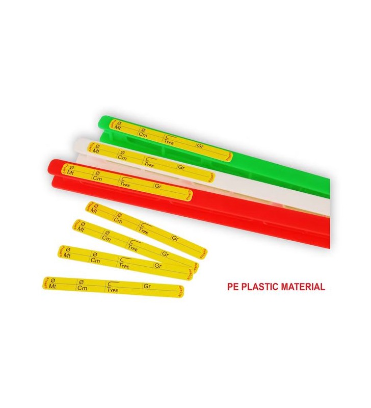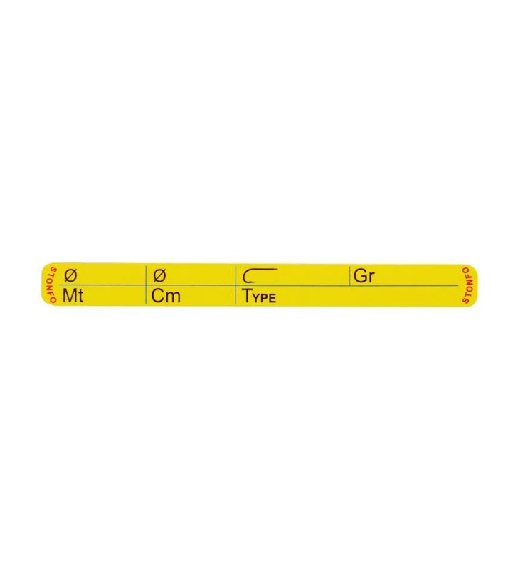Adhesive labels made of plastic material suitable for application on fishing line reels.