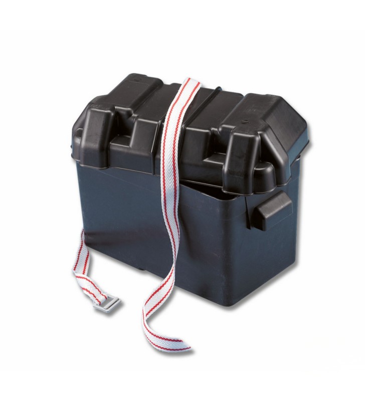 Protective container made of shock-resistant polypropylene designed to house batteries up to 100-110 Ah. It is widely used in marine and camper applications due to its acid resistance and the fact that it features a fastening strap with an adjustment buckle.