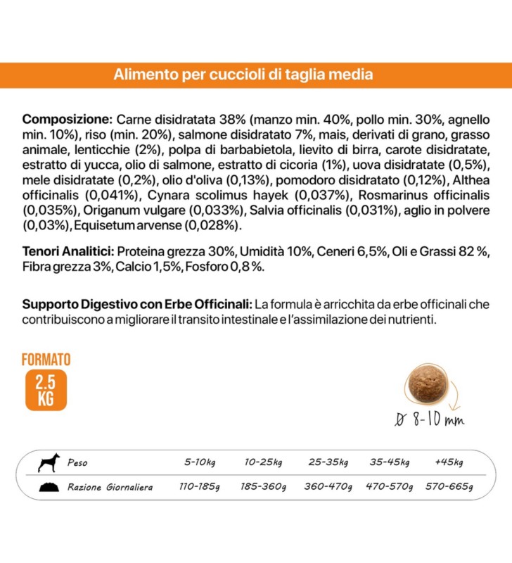 Lovingly formulated for medium-breed puppies, such as lively Beagles, intelligent Border Collies, affectionate French Bulldogs, resilient Siberian Huskies or imposing Chow Chows, at this crucial stage of their growth.