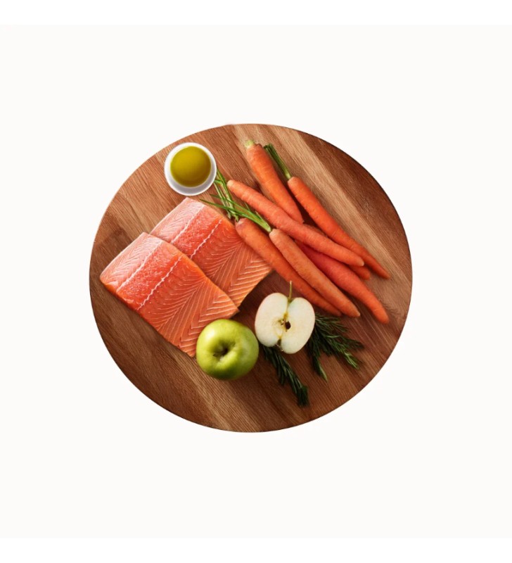 Salmon, rich in Omega-3 fatty acids, promotes healthy skin and shiny coat,