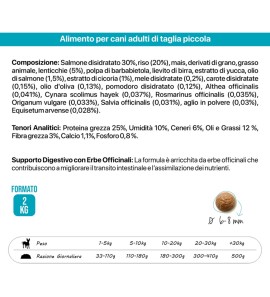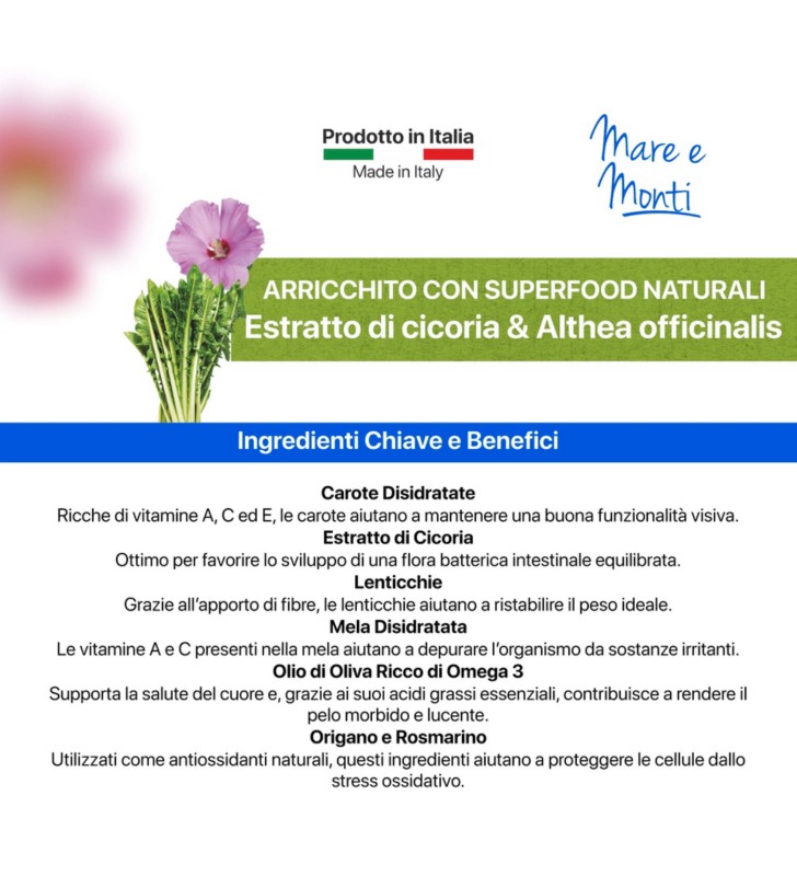 Dehydrated meat 32% (beef min. 40%, chicken min. 30%, lamb min. 10%), rice (min. 20%), dehydrated salmon 7%, corn, wheat derivatives, animal fat, lentils (5%), beet pulp, brewer's yeast, salmon oil, chicory extract (1%), dehydrated apples (0.2%), olive oil (0.13%), dehydrated tomatoes (0.12%), dehydrated carrots, dehydrated potatoes, yucca extract, Althea officinalis (0.041%), Cynara scolimus hayek (0.037%), Rosmarinus officinalis (0.035%), Origanum vulgare (0.033%), Salvia originalis (0.031%), garlic powder (0.03%), Equisetum arvense (0.028%).