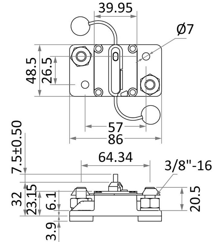 Resettable and releasable by means of a special lever, they perform the functions of fuse and switch at the same time. Manufactured in accordance with USA SAE J1171 / SAE J1625 standards. Allowed voltage: max 48 V, operating temperature: -32 ° + 92 °. With 3/8 "electrical terminals.