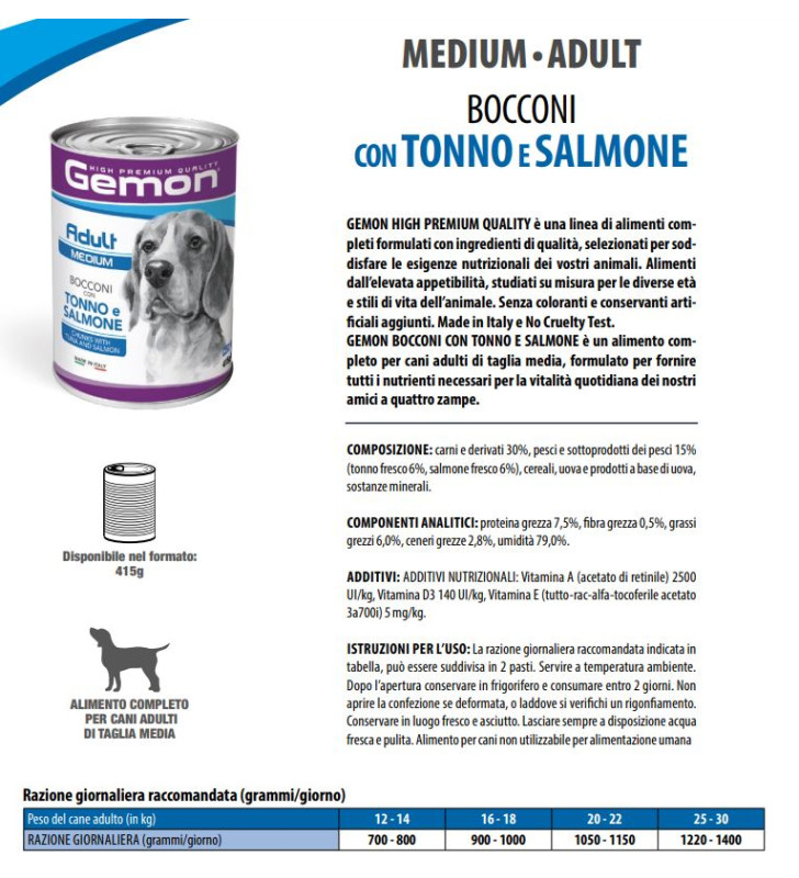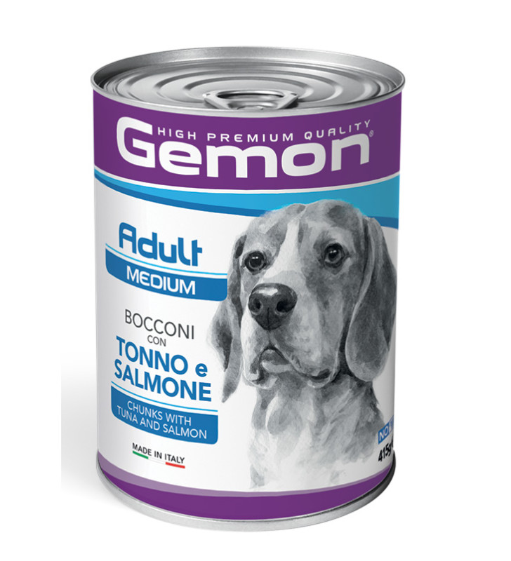 Gemon Bocconi with Tuna and Salmon is a complete food for medium-sized adult dogs, formulated to provide all the nutrients necessary for the daily vitality of our four-legged friends.