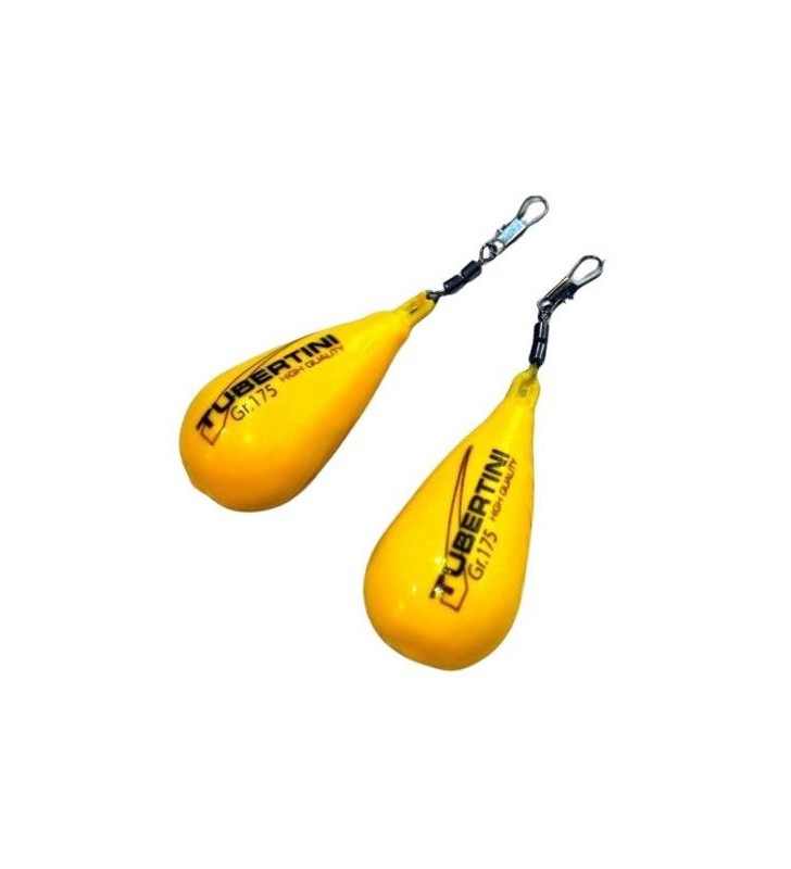 yellow pear-shaped, equipped with a swivel with snap hook to better release twists