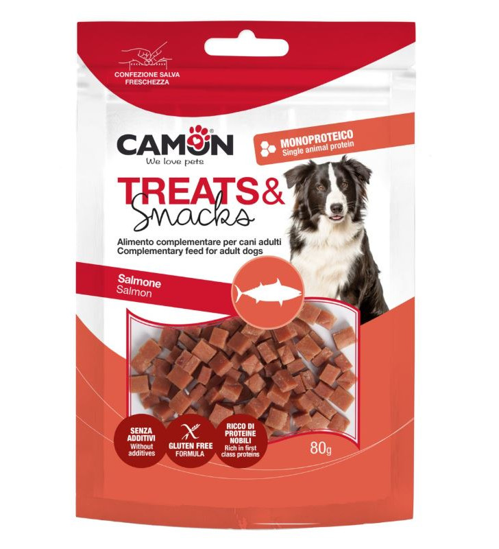 Delicious salmon-based reward snacks for adult dogs.