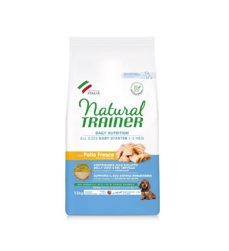 The feed is ready for use and should be served at room temperature. Always leave fresh water available to the animal. Pregnant and lactating bitches: 20 days before giving birth, start gradually replacing the previously used food with Natural Trainer Baby Starter, so that 10 days after giving birth, the animal feeds only with the new food.