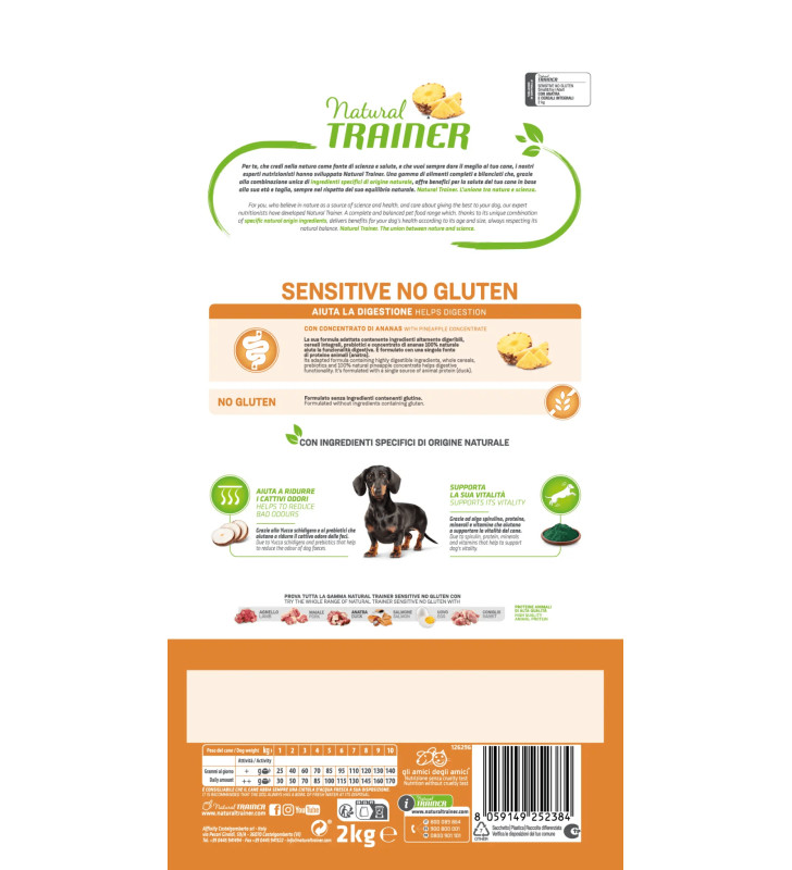 Trainer Natural Sensitive No Gluten Adult Mini with Duck is enriched with 100% natural pineapple extract, prebiotics and whole grains that stimulate proper digestion.