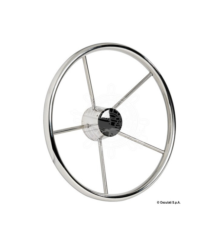 Polished stainless steel steering wheel with stainless steel hub and inclined spokes.