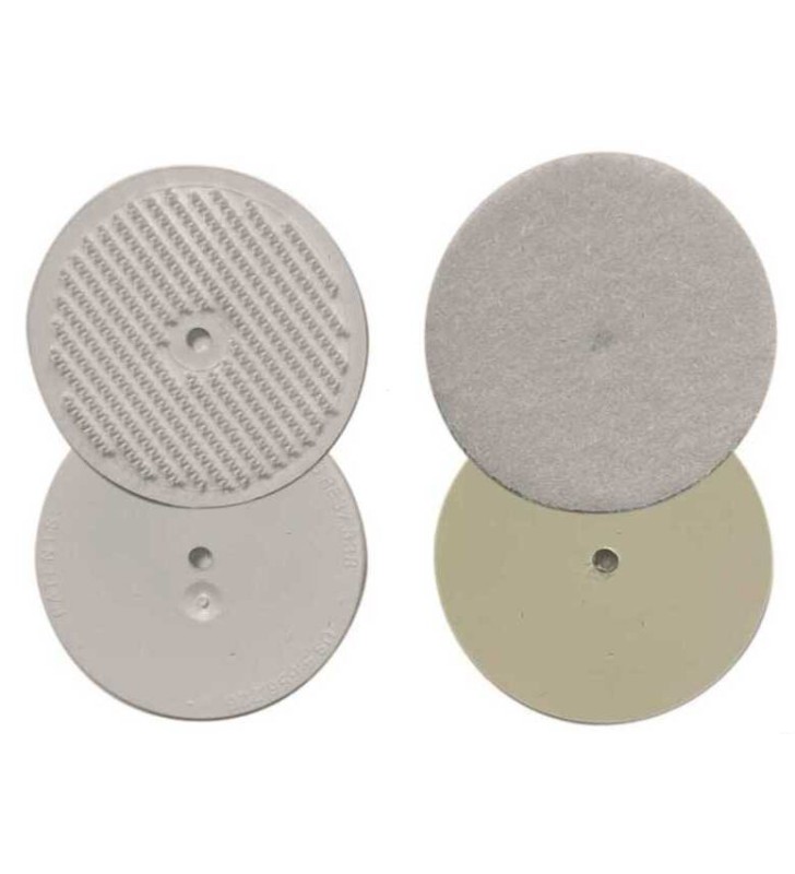 Dischetti rigidi in PVC con nastro ad uncino e foro centrale per il fissaggio meccanico.