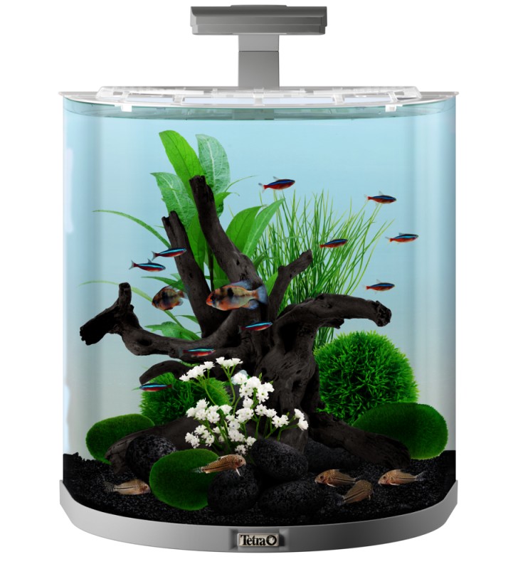 Tetra AquaArt Explorer Line è un set di acquario completo per pesci e gamberi di fiume con vasca dall'affascinante design a mezzaluna e vetro anteriore ricurvo a 180°