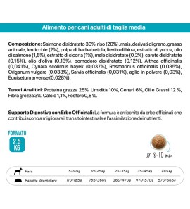 formulato con una sola fonte proteica: salmone, ideale per cani con intolleranze alimentari.