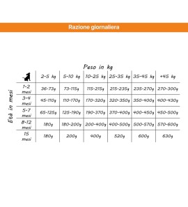 | Peso del cane in Kg | Razione giornaliera in Gr |