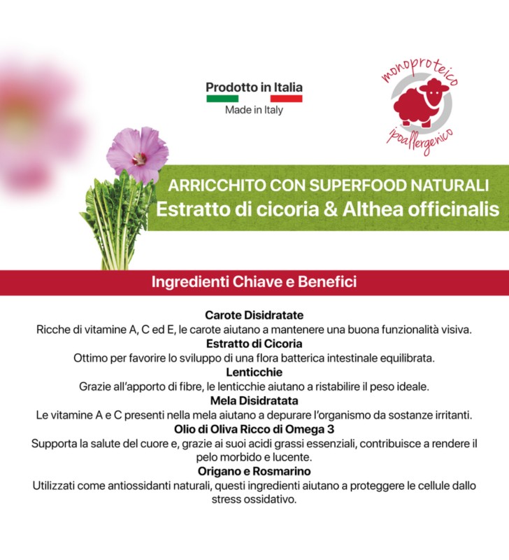 Formula ipoallergenica a base di maiale e altea officinalis per una digestione più facile.