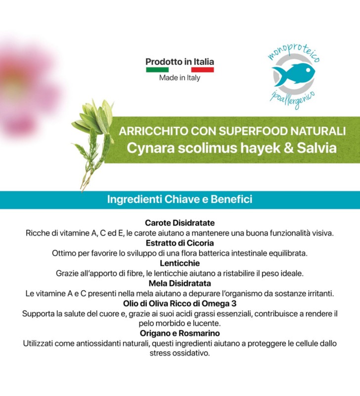 formulato con una sola fonte proteica: salmone, ideale per cani con intolleranze alimentari.