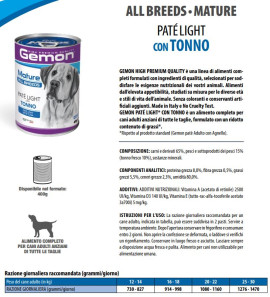 Paté Light con Tonno è un alimento completo per cani adulti anziani di tutte le taglie.