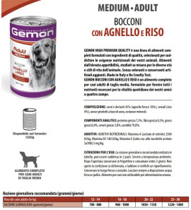 Bocconi con Agnello e Riso è un alimento completo per cani adulti di taglia media.