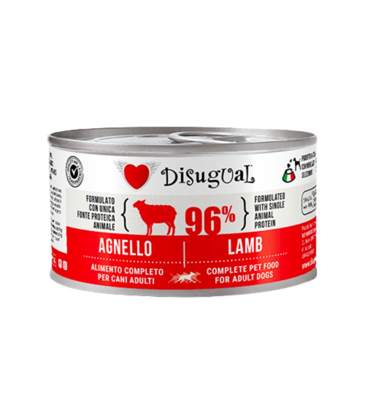 Disugual Agnello è l'alimento umido completo per il tuo cane adulto, formulato con un'unica fonte proteica animale!