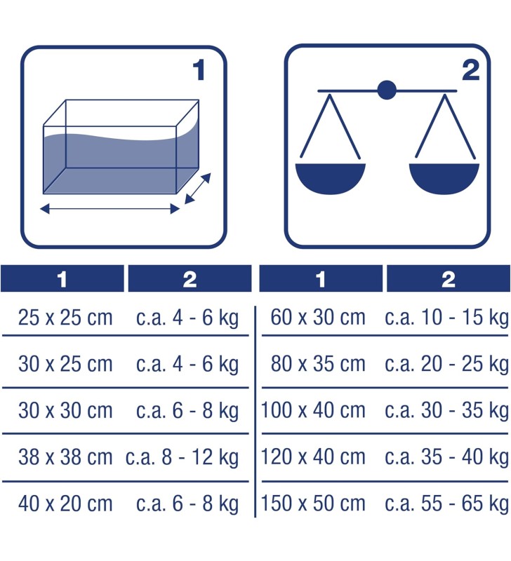 Uso: Per acqua dolce e di mare. Disporre uno strato indicativo di 4 cm nella parte frontale