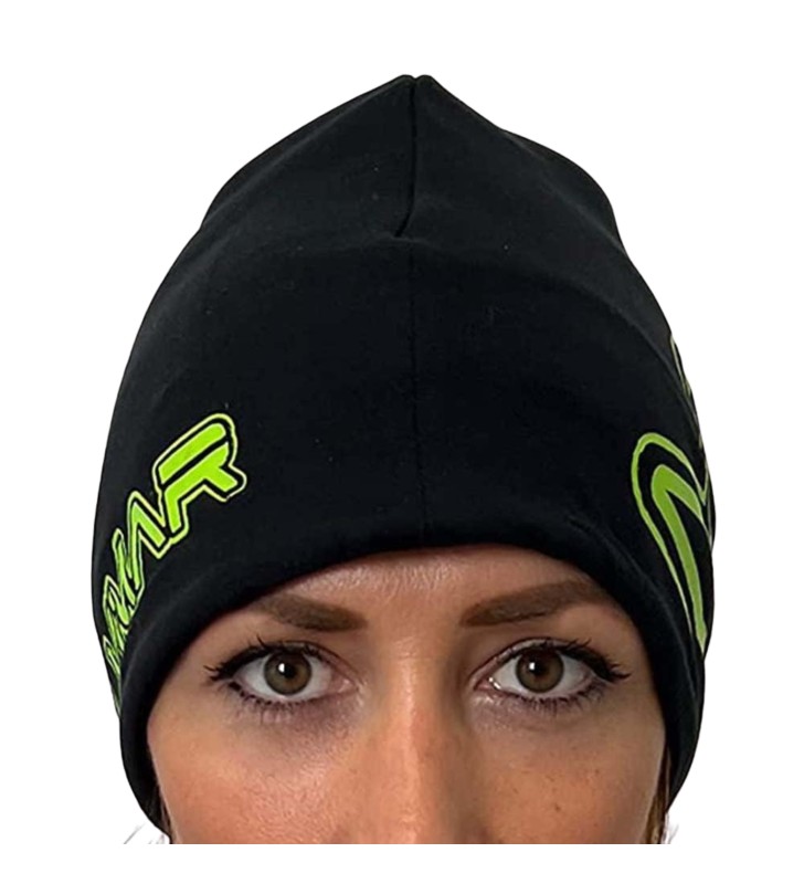 Cappello in pile nero con scritta verde comodo e caldo.