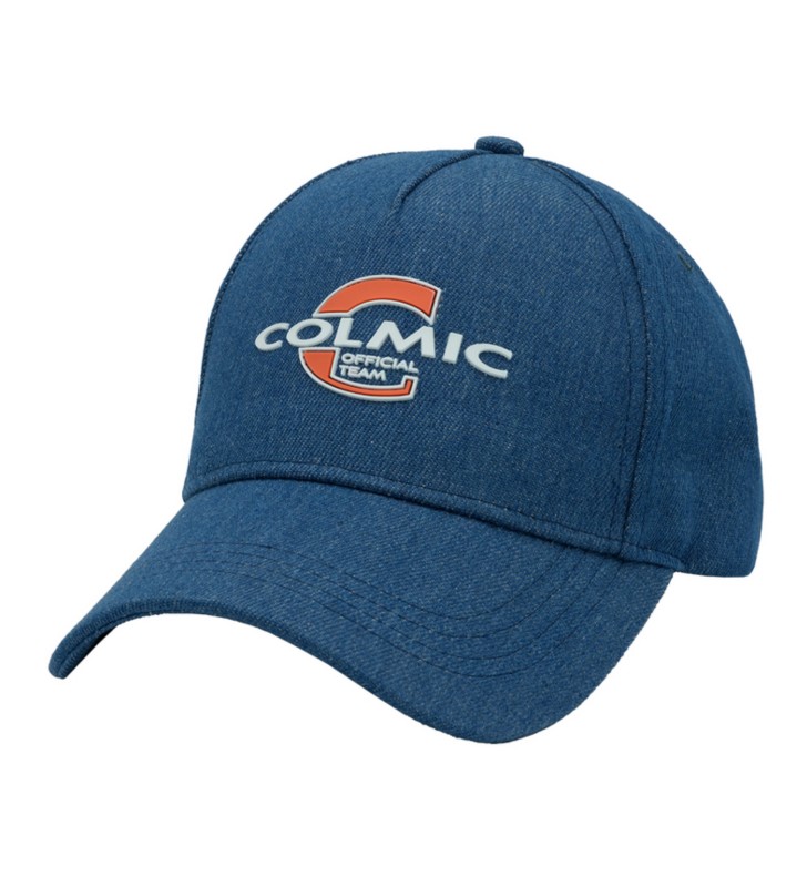 Cappellino in cotone ritorto, Denim, con logo gommato Colmic Official team gommato. Colorazione jeans, simpatico e attuale.