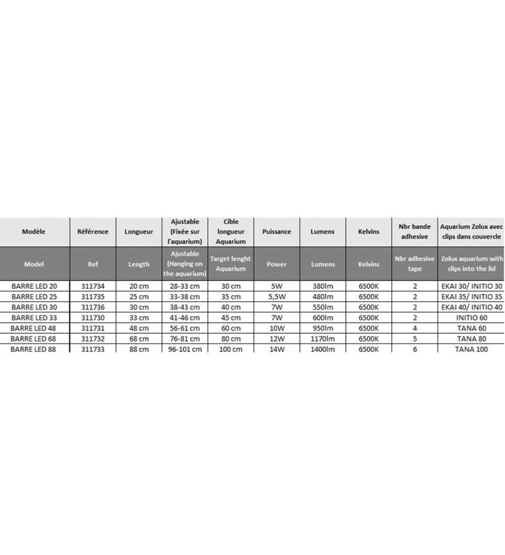 Le barre LED sono regolabili per adattarsi a tutte le dimensioni dell’acquario (vedi tabella).
