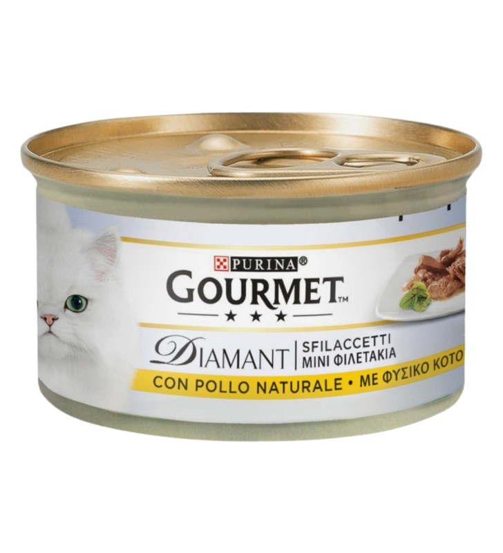 Purina Gourmet Diamant Sfilaccetti 85 g è un alimento umido completo per gatti adulti.