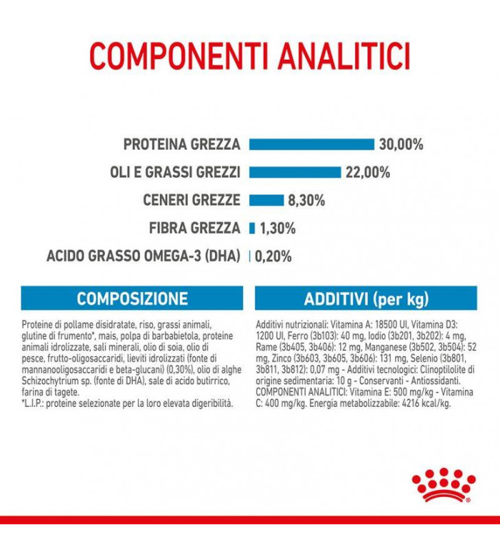 La sua composizione si contraddistingue per la presenza dell'esclusiva formula Start Complex frutto della ricerca di Royal Canin, una combinazione di elementi nutritivi presenti nel latte materno, rinforzata con specifici nutrienti che contribuiscono attivamente a promuovere la salute digestiva e alla costruzione delle difese naturali del cucciolo.