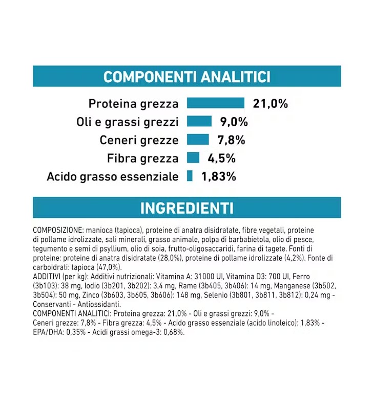 Fonti di proteine: proteine di anatra disidratate (28,0%), proteine di pollame idrolizzate (4,2%).