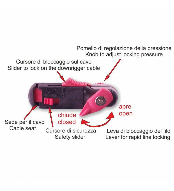 Pinza di sgancio della lenza per la pesca a traina con affondatore. Munita di uno speciale sistema che ne consente il bloccaggio direttamente sul cavo dell’affondatore. Dotata inoltre di pomello di regolazione della pressione di serraggio del filo e di un esclusivo dispositivo a levetta per l'aggancio-sgancio rapido della lenza che permette di aprire o chiudere la pinza senza dover regolare nuovamente la pressione di serraggio. Brevettato.