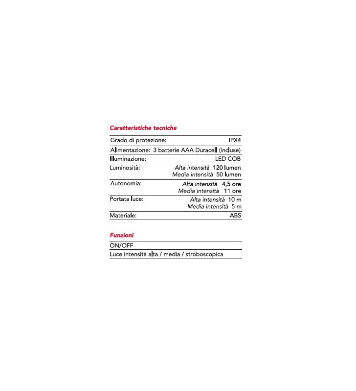 Illuminazione: LED COB Luminosità: alta intensità 120 lumen media intensità 50 lumen