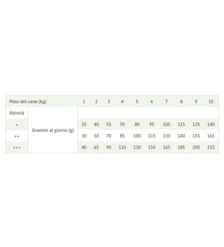 proteina grezza 28%, grassi grezzi 16%, fibra grezza 3%, ceneri grezze 7,5%, omega 3 0,4%, omega 6 3%